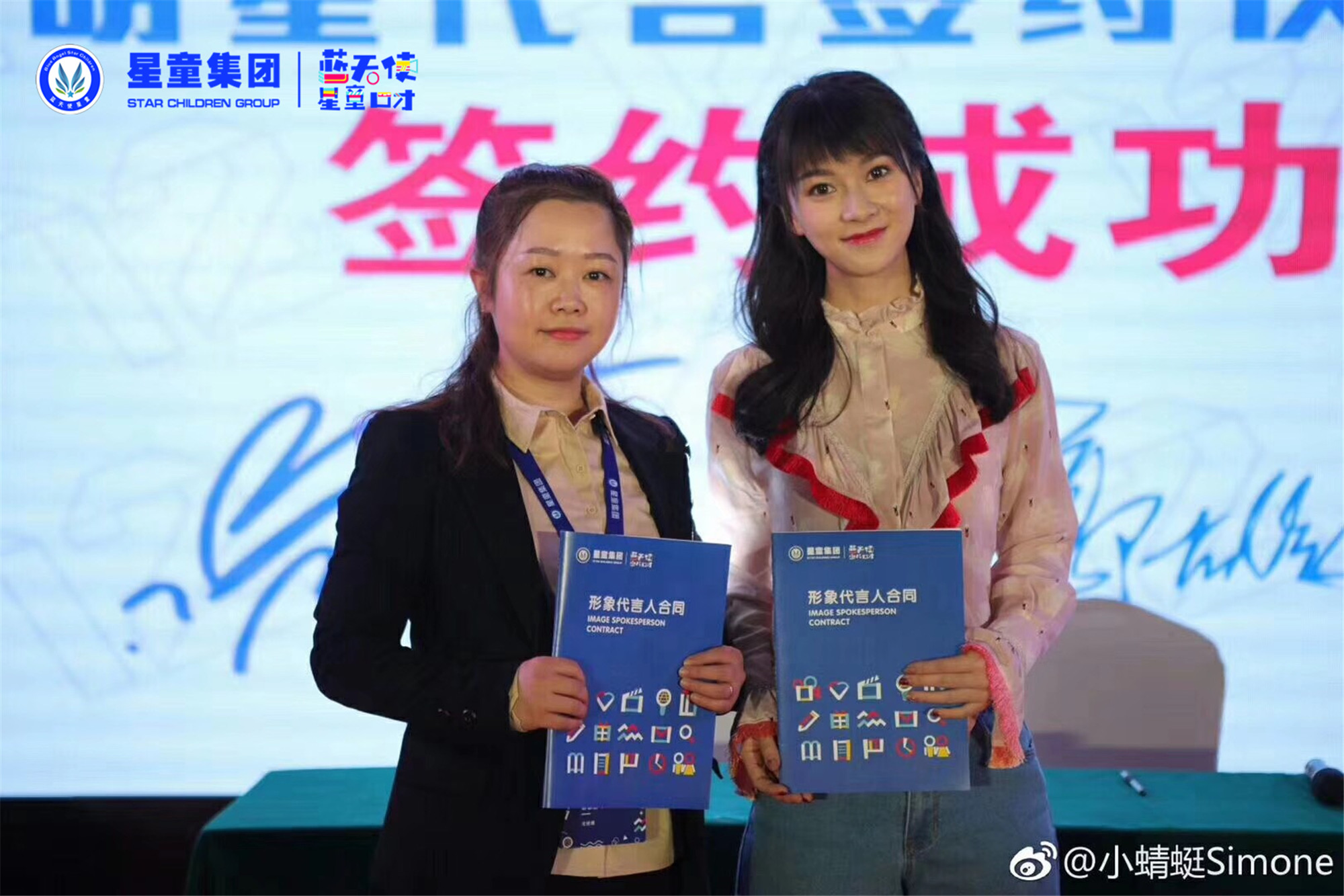 图丨创始人郭校和品牌形象人湖南卫视金鹰卡通“小蜻蜓姐姐”签约现场